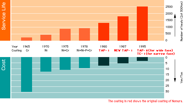 Nomura has developed the surface treatment of mold for continuous casting machine as a domestic pioneer and expanding those products for the world users more than 20 years. The products with new plating technology such as (1) TAP-I, (2) N-TAP and (3) TAP-II as well as with new thermal spray coating contribute to a long life mold (total cost down) with good quality, which are based on our fully controlled quality assurance system. Nomura do mold business totally from designing, choice of materials, manufacturing, surface treatment, finishing to assembling and have good reputation not only from all domestic steel makers but also from many world steel makers.