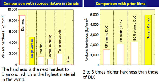 The hardness of "Tough Carbon film" is the next hardest to diamond, and 2 to 3 times higher than prior films