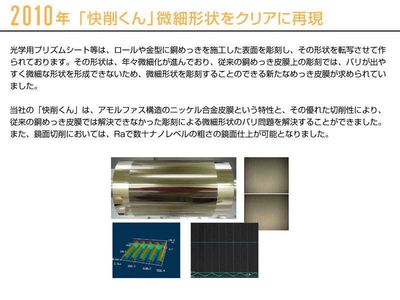 精密切削メーカーの彦山精機様から、「快削くん」が高く評価され、光学シート用エンボスロールにご採用いただきました。これにより超微細形状の大幅な改善につながったそうです。 |