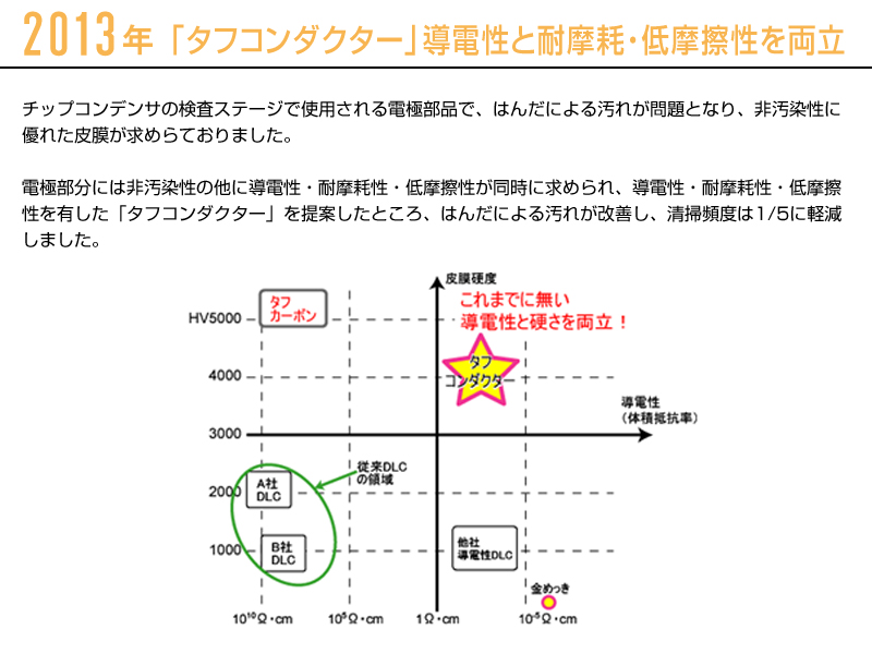 コンデンサーメーカー様向け測定プローブで 皮膜「タフコンダクター」が採用され、 ハンダ汚れの問題を解決しました。 |