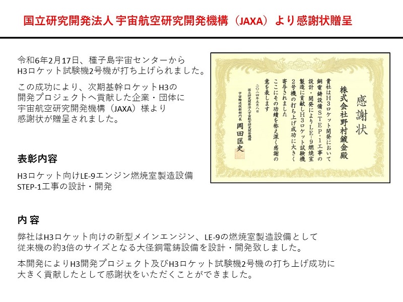 宇宙航空研究開発機構(JAXA)様より H3ロケット開発に貢献したとして表彰 を頂きました。 |