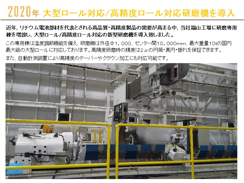 リチウム電池生産設備向けに 大型ロール対応の高精度研磨機を導入 致しました。 |